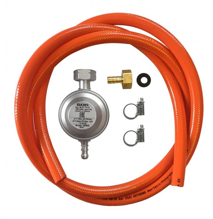 Газові грилі та обігрівачі виробництва компанії Enders завжди комплектуються всім необхідним для максимально простого монтажу, в тому числі шлангом і редуктором (регулятором тиску). Таким чином, для роботи газового обладнання Enders, Вам потрібен лише заправлений газовий балон. А для клієнтів, у яких є газова техніка інших виробників, які не укомплектована редуктором і шлангом, у нас є набори для підключення її до газових балонів. Редуктор для газового балона - це універсальний стабілізатор тиску, який є незамінною частиною газового устаткування. Тиск на виході з газового балона ненормований і залежить від різних чинників, тому між газовим обладнанням та газовим балоном, сполученим газовим шлангом, ставиться редуктор (регулятор тиску газу). Більшість газових приладів працює на фіксованому тиску і для того, щоб тиск газу на виході з балона відповідало тиску на вході в пристрій, ставиться газовий редуктор, що знижує тиск до необхідного рівня. Процес монтажу відбувається без особливих складнощів за допомогою хомутів, що входять в комплект набору. Набір комплектується також штуцером з різьбою. Редуктор володіє виходить рівнем тиску в 30 мбар. Важливо, щоб виходить тиск редуктора відповідало необхідному тиску газового приладу, що, як правило, описано в технічної документації, що поставляється разом з обладнанням.