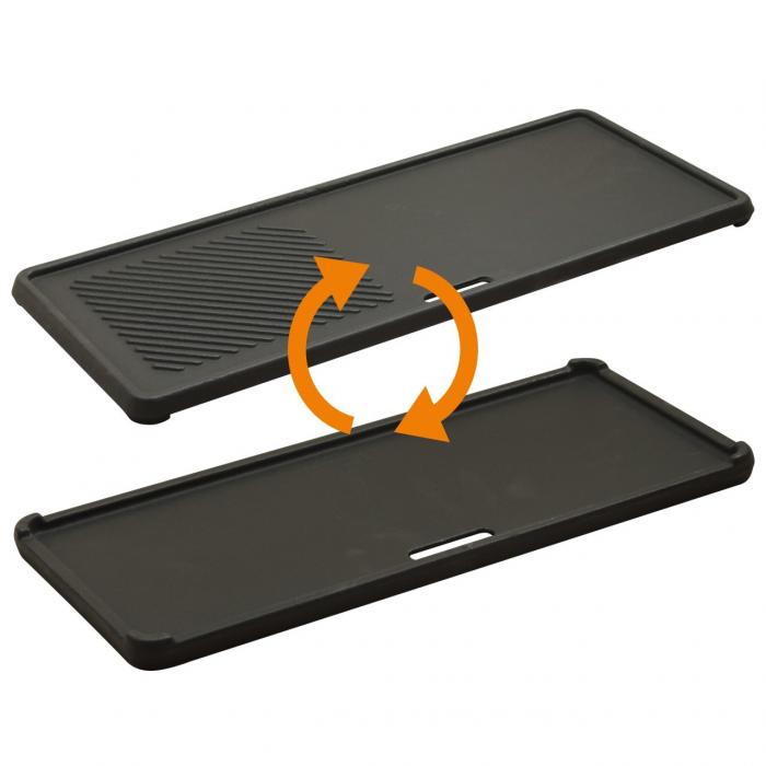 Суцільний двосторонній чавунний деко 1/3 з гладкою гриль-майданчиком, рифленою поверхнею і отвором для стікання жиру. Застосовується в газових грилях BOSTON Black 3 K TURBO, Monroe Pro 3