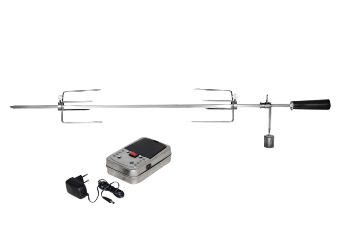 Підходить для всіх грилів Monroe Pro 3 + 4 и Boston 3 + 4. Має плавне регулювання швидкості до 4-х оборотів в хвилину. Простий у використанні і легко миється. Виготовлений з тугоплавких матеріалів. Працює від мережі ~ 220v або від елементів живлення типу - LR 20 (2шт. не входять в комплект).