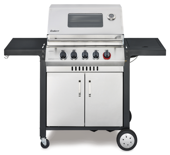 Багате оснащення і висока функціональність - це основні риси нового гриля від компанії Enders - MONROE 3 SIK Turbo! Хочете соковитий стейк з хрусткою скоринкою? Просто ввімкніть пальник з турбо-зоною - і Ви «король вечірки»! Сьогодні Ви справжній гуру грілеванія - адже у Вас в помічниках такий іменитий підмайстер, як MONROE 3 SIK Turbo! І все тому, що цей газовий гриль має три надпотужних пальника Endotube (3 х 4,2 кВт), велику робочу поверхню (65х49 см), турбо-зону, кришку з нержавіючої сталі з великим контрольним вікном, вбудований прецизійний термометр і це ще не все! При бажанні, Ви можете додатково купити вертел з електроприводом і приготувати на ньому курку, гуску або молочного поросяти, а вбудований тильний інфрачервоний пальник для глубокої прожарки прискорить процес грилювання на вертелі. Також в наявності вбудована бокова конфорка, що є дуже зручним доповненням особливо для приготування гарніру або соусу для барбекю. Для поліпшення експлуатаційних якостей корпус MONROE 3 SIK Turbo виготовлений з нержавіючої сталі і має вбудовані колеса для зручності переміщення, а бокова поверхня що опускається допоможе зберігати Ваш гриль навіть не в найбільшій коморі. Газовий балон (12л / 5кг) надійно приховано в нижній шафі гриля в спеціальному піддоні.