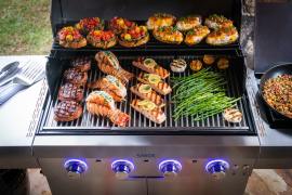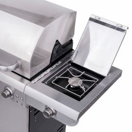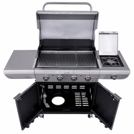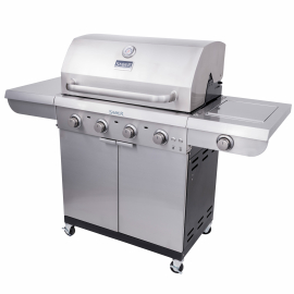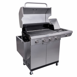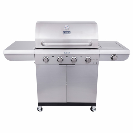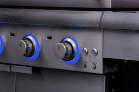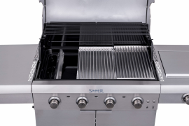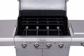 Газовий гриль SABER® Select 4-Burner дарує стравам ідеальний соковитий смак. Ексклюзивна система приготування рівномірно нагріває поверхню гриля та назавжди позбавляє вас спалахів вогню. Цей глянцевий гриль має велику поверхню для приготування їжі з решітками з нержавіючої сталі, які прекрасно себе зарекомендували у ресторанному бізнесі, виготовлені за преміальною конструкцією вони подарують вам роки безвідмовної служби. Велика бічна полиця має достатньо місця, щоб розмістити спеції та кухонне приладдя необхідне вам під час грилювання, а додаткова бокова поверхня для приготування дає вам ще більше простору для ваших кухонних фантазій. Бічна поличка швидко складається, що полегшить вам зберігання гриля. Select 4-Burner обладнаний підсвідкою синього кольору, що додає йому вишуканого стилю, а внутрішня шафка має зручні полички для зберігання найнеобхідніших дрібничок для барбекю.