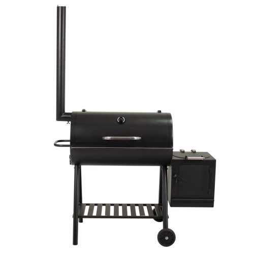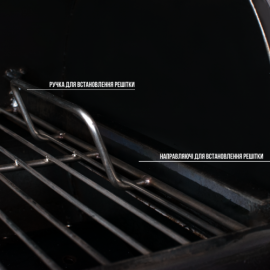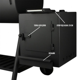 Комплектація: смокер, полиця для інвентарю, полиця з нержавіючої сталі, піч під казан, змінне днище для копчення, димар, ручка для переміщення, 2 решітки гриль з харчової нержавіючої сталі, кочерга, 2 колеса