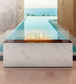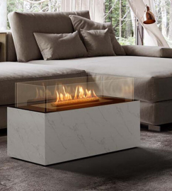 Описание Детали Биокамин CALACATTA Fireplace FLA3 990 BURNER — элегантная новинка Planika выпускает новинки, как из рога изобилия, в стремлении угодить взыскательному потребителю. CALACATTA Fireplace FLA3 — это отдельно стоящий автоматический источник живого огня работающий на биоэтаноле с технологией BEV Technology®. Элегантное устройство с корпусом из спеченной керамики изготовлен из натуральных материалов, которые являются углеродно-нейтральными и экологически чистыми. Биокамины этой модели обеспечивают длинную линию огня с максимальной безопасностью и без установки дымохода или жестких соединений. Большое “семейство” CALACATTA при внешнем сходстве отличается горелками, в данном конкретном случае используется горелка флагманских биоэтаноловых каминов FLA3. Биокамины CALACATTA Fireplace FLA3 990 BURNER — инновационный корпус Если о топовых горелках FLA3 и их передовых возможностях известно многим, то о новом корпусе биокаминов CALACATTA стоит рассказать подробнее. Корпус изготовлен из высококачественного материала Dekton от Cosentinio. Это инновационная, ультракомпактная и высокоэффективная поверхность, предлагающая безграничные возможности дизайна. Изготовлен из спеченной керамики, кварца и стекла. Корпус имеет элегантный и привлекательный вид. ✔ высокая ударостойкость; ✔ огне и термостойкость; ✔ устойчивость к загрязнениям; ✔ высокая стойкость к царапинам. ТЕХНИЧЕСКАЯ СПЕЦИФИКАЦИЯ: Емкость топливного бака 5,5 л Максимальное время горения 10 часа Максимальная тепловая мощность 7 кВт Минимальный объем помещения 70 м3 Регулировка высоты пламени 6 ступени Вес 81.5 кг Тип топлива биоэтанол 95 — 96,6% Дымоход не требуется Скорость воздухообмена 1 объем помещения в час Электропитание 230 В Покрытие черным порошковым покрытием Материалы: огнеупорная керамика, сталь, оцинкованная сталь, закаленное стекло Применение только для внутреннего использования Размеры биокамина: Ширина: 1150 мм Глубина: 450 мм Высота: 614 мм
