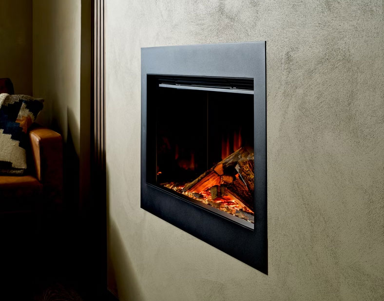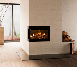 Тристороннє вбудовування дає змогу встановити камін в нішу залишаючи ліву та праву скляні грані на виду. Ми показали вогонь (зліва) припіднятими дровами та вугіллям, щоб доповнити ефект вогоню. В даному дизайні використовується сучасний підхід до класичного оформлення.