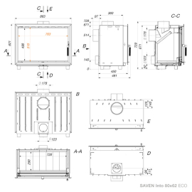 Камінна вставка SAVEN - це високі показники продуктивності, потужність та ККД. Ефективне горіння і допалювання піролізних газів можливі завдяки передовим рішенням поєднання футерування камери згорання шамотом товщиною 35 мм та вермикулітом товщиною 30 мм.