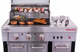 Інфрачервоний газовий гриль-кухня Char-Broil PLATINUM MOK 3. З ним ви отримуєте повний пакет переваг грилів марки Char-Broil. Завдяки своїй гнучкій конфігурації, цей газовий гриль можна інтегрувати у модульну вуличну кухню Char-Broil® так, як ви самі забажаєте. Крім своїх численних варіантів конфігурації, гриль також пристосований для роботи в будь-який час доби завдяки вбудованим галогенним і світлодіодним підсвічуванням зони приготування та ручок пальників. Серед додаткових переваг гриля Char-Broil PLATINUM MOK 3; високоякісна нержавіюча сталь, надійне електронне запалювання SureFire®, дві висувні полички для аксесуарів та газового балона, колеса та ніжки, які регулюються по висоті.