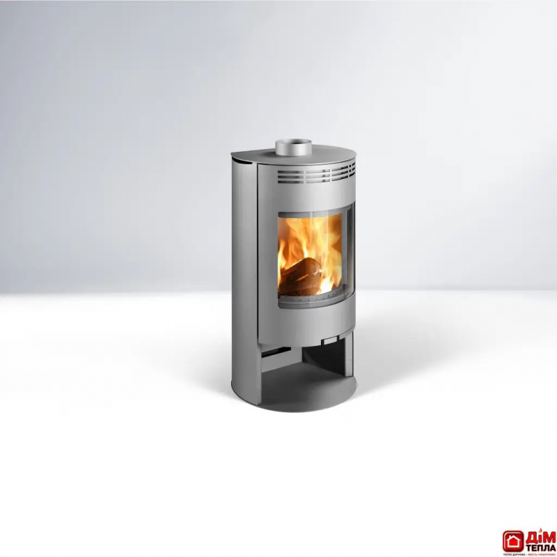 Компактна кругла піч з панорамним оглядовим склом, гладкою металевою поверхнею, виконана в сучасному дизайні, може стати основним акцентом інтер'єру в стилі хай-тек.