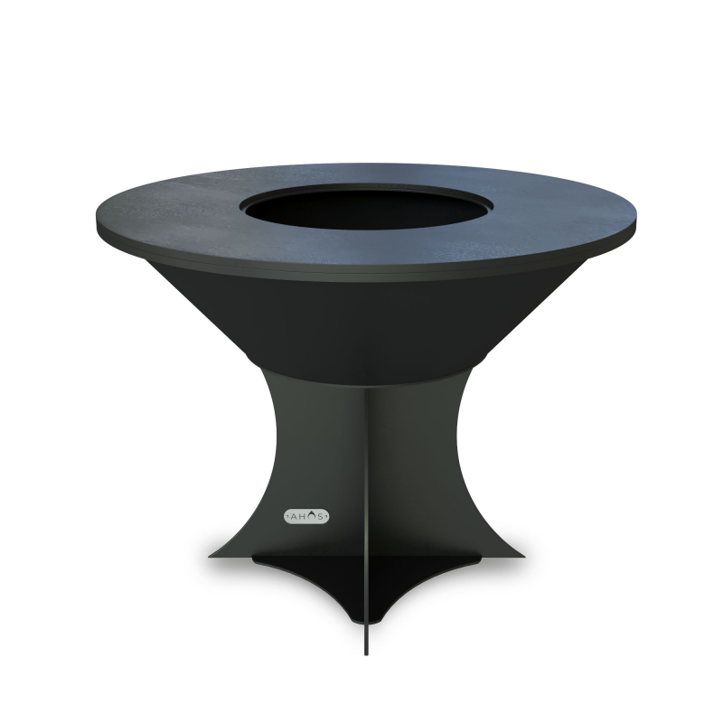 Круглий гриль AHOS складається з трьох частин: чаші топки, диска-поверхні для смаження і ніжки. Чаша виготовлена з імпортної сталі марки S235JR, її форма продумана таким чином, щоб рівномірно розподіляти тепло по поверхні для смаження. Поверхня для смаження з товстої вуглецевої сталі товщиною 8 мм володіє чудовою теплоємністю. Вкрита органічним багатошаровим антипригарним покриттям, що перешкоджає прилипанню їжі навіть при дуже високих температурах, вона дозволяє готувати практично будь-які страви, від яєчні до стейків, від овочів гриль до млинців.